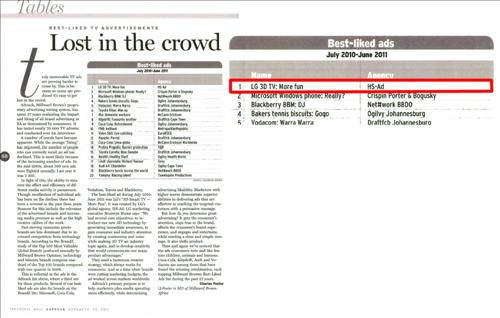 세계적 브랜드 평가 전문회사인 밀워드 브라운 남아공 지사는 작년 7월부터 올해 6월까지 남아공에서 방영된 2천250여편의 TV 광고에 대한 소비자 조사를 실시해 LG 시네마 3D TV 광고(LG 3D TV: More fun)를 1위로 선정했다. 이 CF는 셔터안경 방식의 3D TV보다 우수한 시네마 3D TV의 밝기를 익살스럽게 강조한 글로벌 TV 광고다.