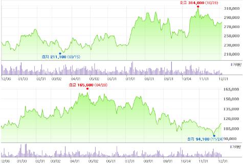 반면 GS홈쇼핑 주가는 1년간 제자리걸음이다. 작년 12월 10만원을 간신히 넘던 GS홈쇼핑 주가는 올해 4월 16만원대까지 오르며 상승세를 탔으나 하반기 실적부진으로 주가는 1년 전 수준으로 되돌아갔다.