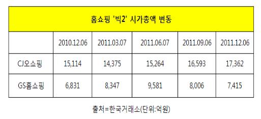 1년 전 CJ오쇼핑과 GS홈쇼핑의 시가총액은 약 800억원의 차이를 보였으나 6일 1천억원을 훌쩍 넘기며 사상 최대의 격차를 기록했다.