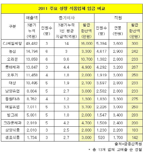 한편 주요 식품업체 13곳에 기준한 식품업계 직원 평균 연봉은 2천853만원으로 집계됐다.