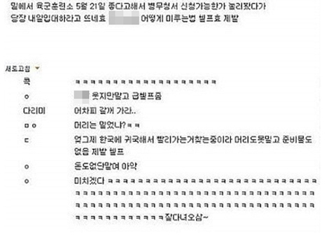 6일 인터넷 게시판에 이 글을 올린 네티즌은 “육군훈련소 5월 21일이 좋다고 해서 병무청서 신청 가능한가 눌러봤다가 당장 내일 입대하라고 떴다. 어떻게 미루는 법 좀 제발 알려주세요”라고 자신의 다급한 사연을 전했다.