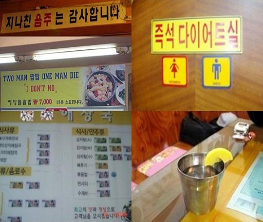 또한 눈에 띄는 사진은 'TWO MAN 짭짭 ONE MAN DIE, I DON'T NO'라는 글귀는 ’둘이 먹다가 하나가 죽어도 모른다‘는 의미를 엉터리 영어로 풀어 내 폭소케 했다.