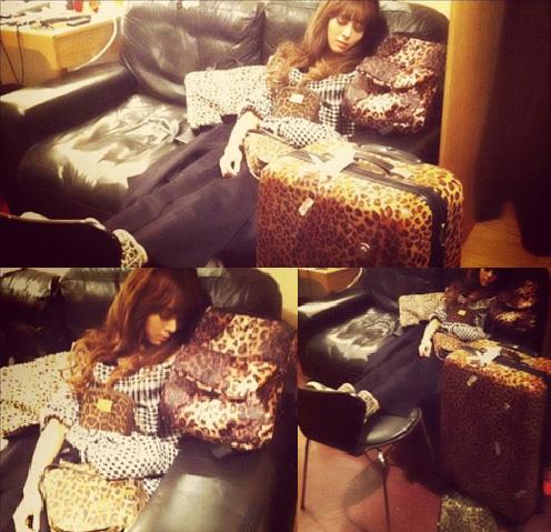 사진 속 지나는 소파에 누워 눈을 감고 있다. 자고 있는 지나 주위로 호피무늬 가방, 캐리어, 파우치 심지어 호피무늬 신발까지 온통 호피무늬 물건이 있다. 지나 물건을 통해 지나의 남다른 호피사랑을 엿볼 수 있다.