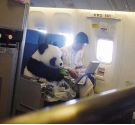 공개된 사진에서 판다는 사람처럼 비행기 좌석에 앉아 무릎 담요를 덮고 풀을 뜯고 있다.