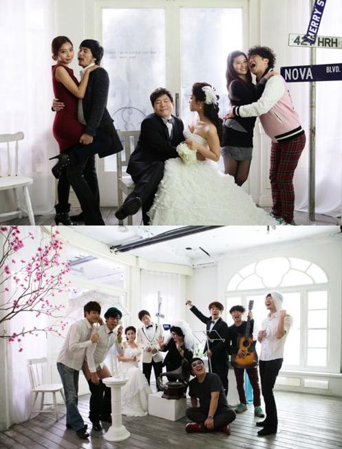 특히 이날 촬영에는 두 사람을 축하해주기 위해 '웃찾사' 동료개그맨들이 총출동해 '시기하는 신부'와 '야한 포즈', '웨딩드레스 입은'신랑 등 다양한 포즈를 취해 촬영현장 분위기를 화기애애하게 만들었다.