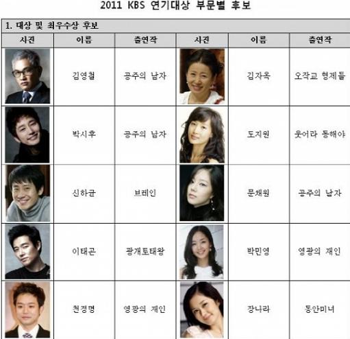 2011 KBS 연기대상 후보자 명단이 공개돼 화제다.