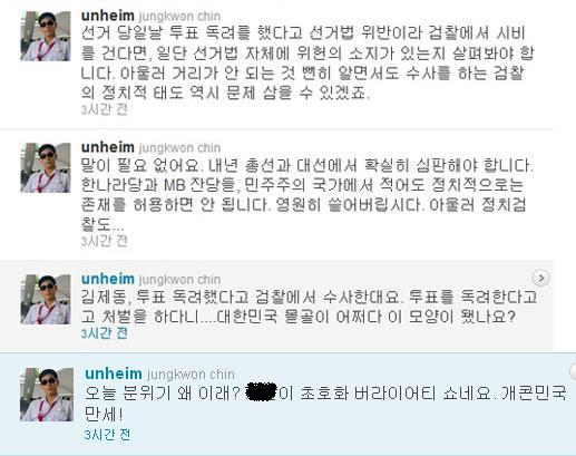 이어 “유명인이든, 무명인이든, 투표를 하자고 얘기하는 게 왜 문제겠어요”라고 반문한 후 “선관위의 해석 자체가 SNS에 불만이 많은 MB정권과 한나라당의 당파적 요구를 수용한 것”이라고 주장했다.