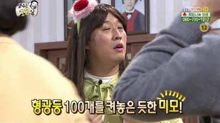 이같은 정준하의 모습 밑에는 자막으로 '형광등 100개 켜놓은 미모'라는 자막이 등장했다.