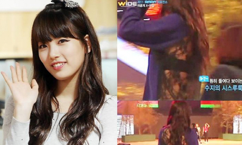 수지는 화장기 없는 청순한 외모에 보라색 니트를 입은 수수한 옷차림으로 무대 순서를 기다렸는데 뒷 모습은 등이 훤히 보이는 망사의상으로 반전패션을 선보였던 것.