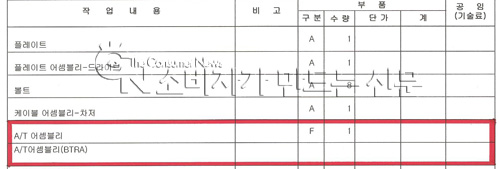 ▲박 씨의 1차 수리 내역. A/T 어셈블리가 내역에 기재돼있다.