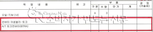 수리 후 기사로부터 정비내용을 듣던 박 씨는 이해할 수 없는 점을 발견했다. A/T 어셈블리를 다시 교환했으나 수리내역에는 ‘컨버터 어셈블리-토크’로 기재돼 있는 것.