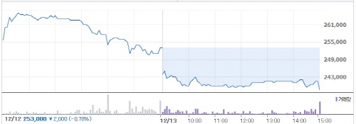 농심은 13일 전 거래일 대비 1만4천500원(5.73%) 내린 23만8천500원에 장을 마감했다. 지난 7일(26만5천원)부터 4일 연속 약세를 면치 못하고 있다.