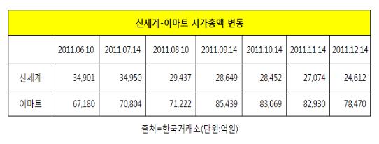 반면 이마트는 재상장된 지난 6월 10일 종가 22만3천500원, 시가총액 6조7천180억원으로 유가증권시장에 첫 발을 디뎠다. 6개월 지난 14일 시가총액은 1조1천290억원이나 불어난 7조8천470억원을 기록했다. 지난 9월에는 탄력 받은 주가에 힘입어 시가총액이 8조5천억원 규모까지 불어나기도 했다.