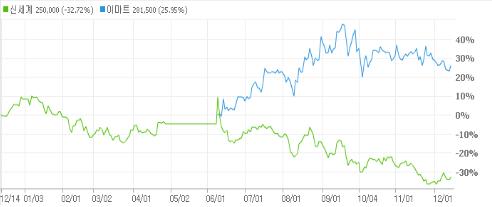 코스피시장에서의 시가총액 순위도 현저하게 차이 났다. 15일 기준 신세계 상장주식수는 984만주, 이마트 2천787만주로 총 발행된 주식의 규모차이가 있어 단순비교는 힘들지만 몸값을 올려가는 이마트와 오히려 뒷걸음질 치는 신세계의 차이는 확연히 드러났다.