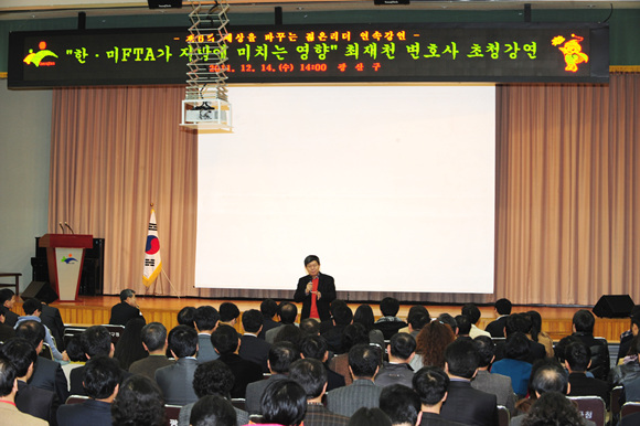 URL복사 기사공유하기 스크랩 프린트 메일보내기 글씨키우기 광주시 광산구(구청장 민형배)는 14일 오후 법무법인 한강 최재천 대표변호사를 초청해 ‘제6회 세상을 바꾸는 젊은리더 연속강연’을 개최했다. 이날 최 변호사는 ‘한미FTA가 지방에 미치는 영향’이라는 주제로 공직자, 일반주민 300여명의 참석자에게 한미FTA 협정문 주요내용과 전망에 대해 강연했다. [마이경제 뉴스팀/소비자가 만드는 신문=노광배 기자] 저작권자 © 소비자가 만드는 신문 무단전재 및 재배포 금지 노광배 기자 다른기사 보기 URL복사 기사공유하기 주요기사 연임 성공한 진옥동 신한금융 회장, 비은행 강화 등 과제 산적 SKC, 박동주 CFO 선임...그룹 재무 전문가 영입해 펀더멘털 강화 나서 디지털 자산시장 변화와 금융소비자 보호 방안 모색을 위한 공동 세미나 개최 광동제약, 각자대표 체제 도입...최성원-전략·신사업·R&D, 박상영-조직운영 한국인터넷신문협회, 뉴스생산자 중심 자율심의기구 가동...‘인신윤위 서약’ 협회 차원에서 탈퇴 결의 NH농협금융 계열사 임원 인사 "새로운 농협 만들어갈 인재 등용 초점"