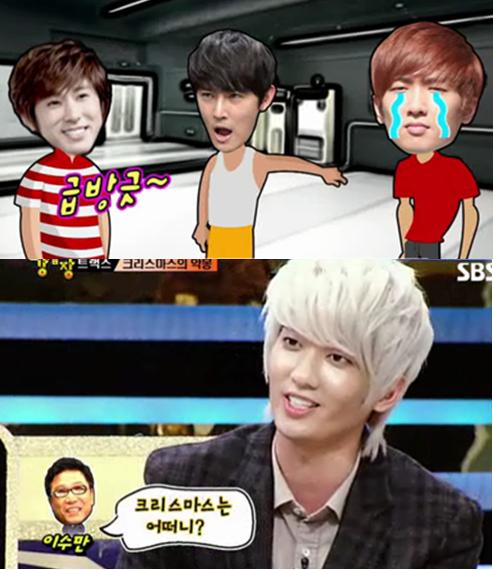 함께 출연한 트랙스 멤버 정모는 SM 작명법에 대해 “나에게는 X마스를 추천해주셨다”라며 유노윤호가 "우리 팀 이름이 동방신기래요"라고 할 때 트랙스 멤버 제이는 "'얘는 크리스마스래'라고 위로했다”고 말해 출연진들을 폭소하게 만들었다. (사진-SBS 방송 캡처)
