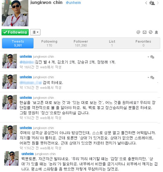 이어 "토론이야 뭐 바를 수도 있고, 발릴 수도 있는 거. 앞으로 나꼼수 자체를 발리지 않게 만드는 게 가장 중요하죠. 방어의 논리를 갖추는 것은 그 다음이구요"라며 "아무리 말발이 세도 정당화할 수 없는 것을 정당화하는 데에는 한계가 있거든요"라고 의견을 드러냈다.