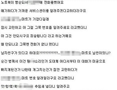전화를 받은 상담원은 가까운 서비스센터로 XXX마트를 알려줬고, 이에 게시자가 “그럼 그쪽 번호 좀 알려주세요”라고 요청하자, 상담원은 “그건 안 되시고요. 죄송합니다”라고 답했다.