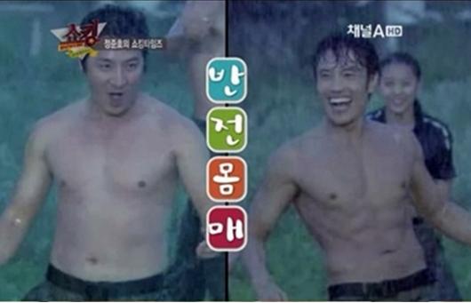 정준호는 당시 이병헌과 훈련하는 장면이 있었는데 PD가 "부담스러우면 반팔이라도 입고 하라"고 했다고 전하며 "입으려면 같이 입고 벗으려면 같이 벗어야지”라며 벗은 사연을 전했다.