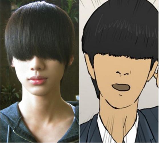 사진에는 6인조 신예그룹 보이프렌드 멤버 광민과 웹툰 '패션왕'의 주인공 우기명의 모습을 비교해 놓은 모습으로 광민과 웹툰 주인공의 머리 스타일이 흡사해 웃음을 준다.