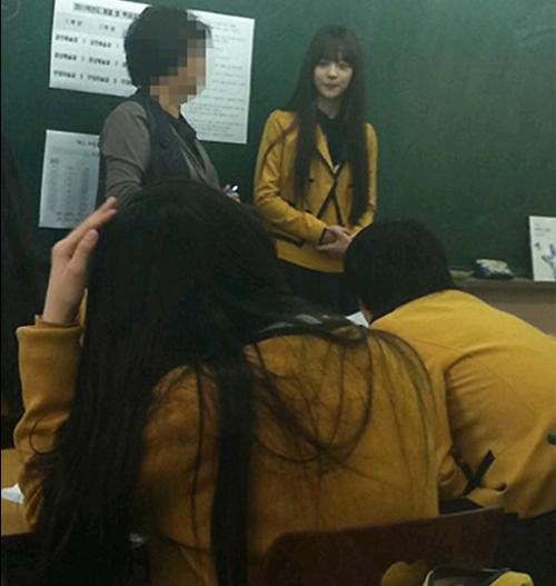 사진에서 설리는 교실에서 꾸미지 않은 모습으로 서 있지만 작은 얼굴과 미모가 눈에 띈다.