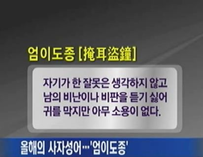2011년을 대표하는 사자성어로 '엄이도종(掩耳盗鐘)'이 선정됐다.