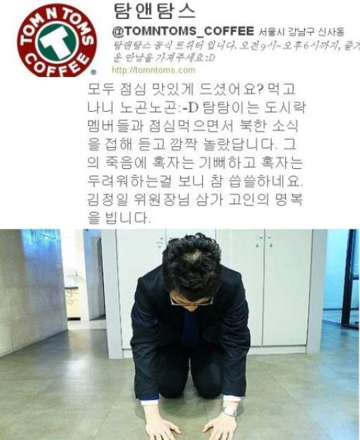 탐앤탐스 트위터 관리자는 19일 김정일 사망 소식에 “점심 먹으면서 북한 소식을 접해 듣고 깜짝 놀랐다. 그의 죽음에 혹자는 기뻐하고 혹자는 두려워하는 걸 보니 참 씁쓸하다. 김정일 위원장님 삼가 고인의 명복을 빕니다”라는 글을 올렸다.