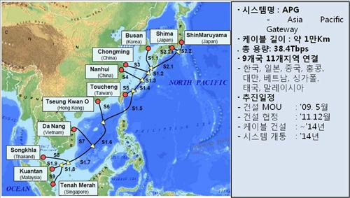 해저 광케이블인 '아시아 퍼시픽 게이트웨이'(APG)는 세계 해저 케이블 중 가장 빠른 38.4테라bps(Tera bit per second)의 속도를 갖췄다. 700메가바이트(Mega byte) 분량의 영화 7천200편을 1초에 전송하는 속도다.