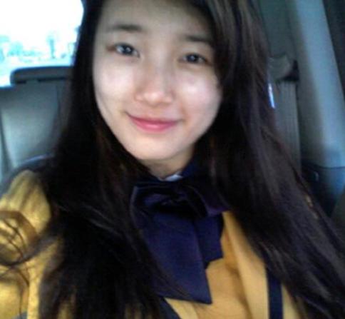 공개된 수지의 교복 사진은 수지가 전혀 꾸미지 않은 민낯으로 셀카를 찍고 있다.