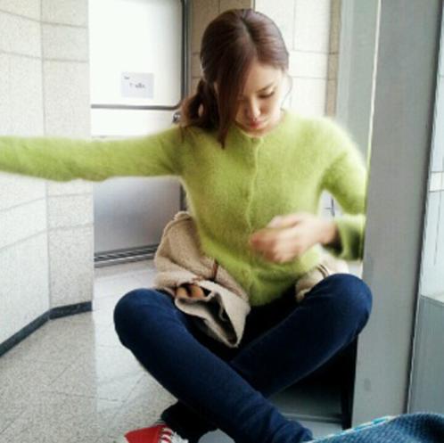 게재된 사진에서 효민은 연두색의 앙고라 니트를 입고 바닥에 앉아있다.