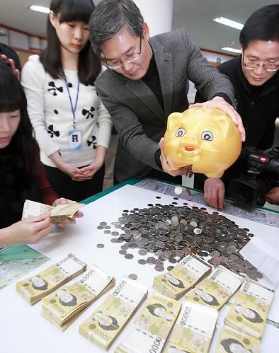 이 `얼굴 없는 산타`는 동전이 가득 든 황금색 돼지저금통과 5만원권 현금뭉치가 든 종이 상자를 두고 사라졌다.