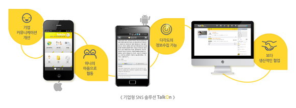 토크온은 수직적이며 보수적인 기존 기업문화에 SNS 소통방식을 접목해 부서별 그룹관리, 동료관리, 자료공유 등의 기능을 가능케하는 기업형 SNS 솔루션이다.