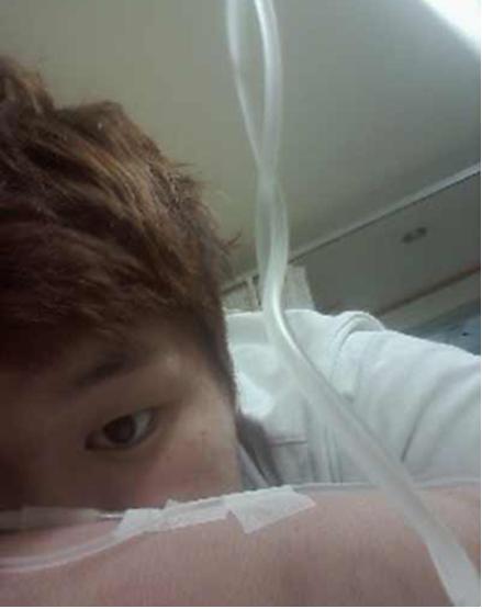 공개된 사진에서 김도현은 병원 침대에 엎드려 링거를 맞고 있다.