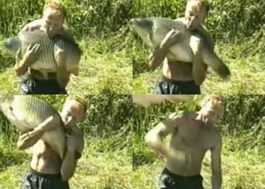 '붕어의 절대적인 힘'이라는 제목의 이 동영상은 4초 정도의 짧은 분량인데, 몸집이 큰 외국인 남성이 자신의 몸통 크기만 한 커다란 붕어를 끌어안고 인증샷을 찍을 준비를 하고 있다.