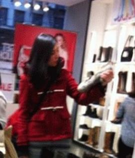 사진 속 왕조현은 빨간색 코트를 입은 캐주얼한 차림으로 신발을 고르고 있다. 세월이 흘러도 변함없는 긴 생머리와 하늘하늘한 몸매가 눈길을 끈다.