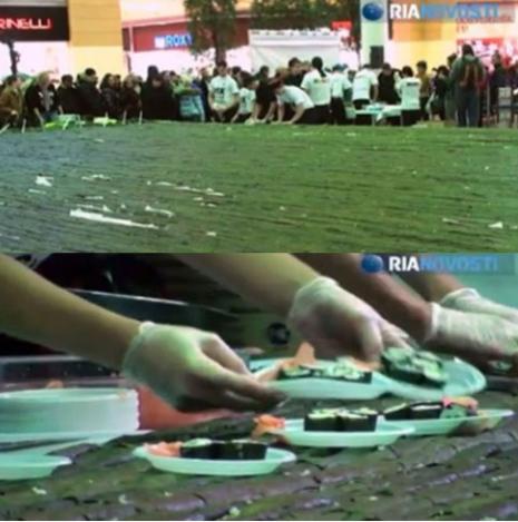 지난 21일(현지시간) 러시아 예카테린부르크의 한 일식당에서는 새로 오픈하는 식당 홍보를 위해 요리사들이 길이 2.5km에 달하는 일본식 스시롤을 만들었다.