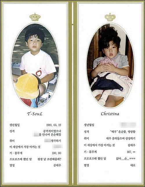 김태우가 방송관계자 등 지인들에게 돌린 청첩장에는 김태우와 예비 신부의 어린 시절 사진이 담겨있다. 특히 사진 밑에는 두 사람의 생년월일, 성격, 키, 프러포즈때 했던 말 등이 적혀있어 눈길을 끈다.