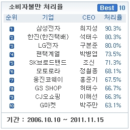 다음은 80.3%의 해결률을 기록한 한진과 80.0%의 LG전자가 근소한 차이로 2, 3위를 차지했다. 뒤를 이어 4위는 팬택계열(73.5%), 5위는 SK브로드밴드(71.3%)가 상위권에 안착했다.