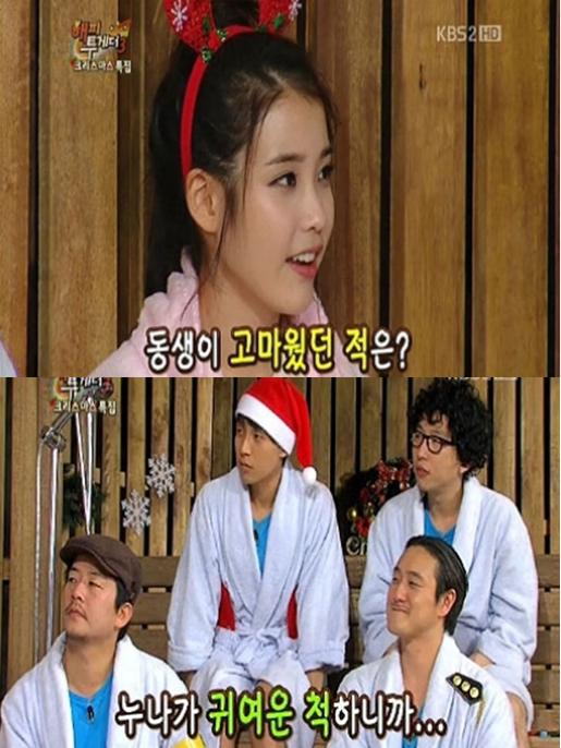 22일 KBS 2TV `해피투게더 시즌3` 크리스마스 특집에 출연한 아이유는 자신의 동생이 아이유 동생인 사실을 숨기고 있다고 말했다.