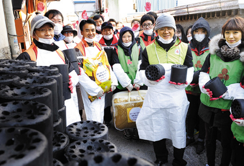 앞서 아주그룹 문규영 회장은 8일 직원 150여명을 이끌고 서울 방배동 전원마을에서 연탄을 져 나르고 김치를 배달했다.