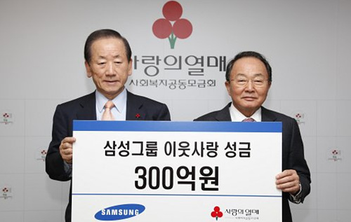 삼성그룹과 현대그룹은 올해 사회복지공동모금회에 각각 300억원과 150억원의 통큰 성금을 기탁했다. 삼성그룹은 삼성생명 이수빈 회장과 삼성사회봉사단 서준희 사장이, 현대차는 정의선 부회장이 직접 사회복지공동모금회를 찾았다. 삼성과 현대차 모두 성금규모가 작년보다 100억, 50억원 늘었다.
