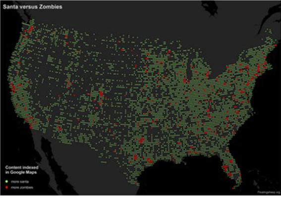 지도상에서 초록색 눈금은 '산타'를 검색한 빈도표, 빨간색은 '좀비'를 검색한 빈도표로 산타 대 좀비 인기 대결에서 녹색 눈금이 많았다. 그러나 산타의 인기가 압도적으로 많을 것이라는 예상과는 달리 좀비를 검색한 빨간색 눈금이 여러 곳에서 예상보다 높은 인기를 얻고 있어 눈길을 끈다.