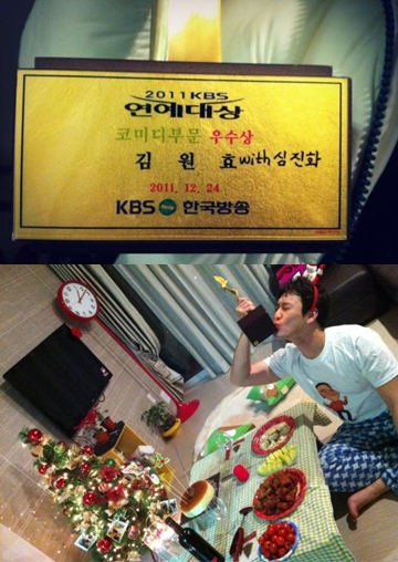 공개된 사진에는 음식이 차려진 상 앞에서 트로피에 입을 맞추고 있는 김원효와 트로피에 'with 심진화'라고 적은 부분이 담겨있다. 심진화는 사진에 대해 "상 받고 상에다 이렇게 깜찍한 행동을! 우리 남편 최고입니다!"라며 기쁨을 표현했다.