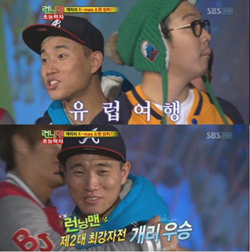이어 개리는 다시 시작된 미션에서 마지막 유재석을 이기고 최강자로 등극해 자신이 원했던 유럽여행을 선물로 받게 됐다. (사진-SBS 방송 캡처)