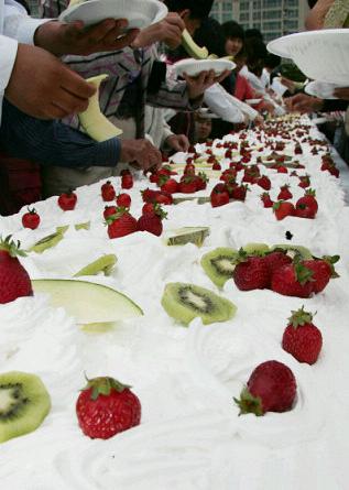경남 창원시 만남의 광장에서 열린 `feel 경남사랑 2008 향토음식 경연대회'에서 행사 참가자들이 30m 생크림 과일 케이크를 직접 장식을 하고 절단하였다.