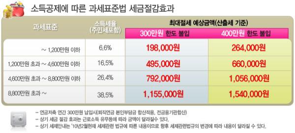 연금저축보험은 올해부터 연간 400만원까지 소득공제가 확대됐다. 현재 한국의 종합소득세율은 8~35%이지만 소득세의 10%가 주민세로 추가되기 때문에 과세표준액의 8.8 ~ 38.5%를 부담하게 된다.