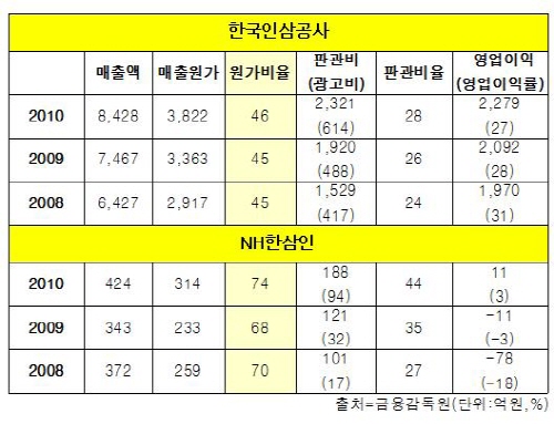 반면 경쟁브랜드인 농협중앙회 자회사 NH한삼인의 ‘한삼인’브랜드 제품 원가비율은 68~74%에 달하고 있다.