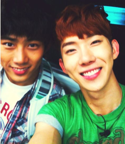 사진 속 조권과 택연은 해맑게 웃고 있으며 서로 대비대는 얼굴색이 눈에 띈다.