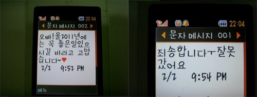 첫 번째 사진 속 문자에는 “오빠! 올 2011년에는 꼭 좋은 일 있으시길 바라고 고맙습니다~♥”라는 애교 섞인 인사가 담겨있다. 그러나 2분 뒤에 도착한 문자에는 “죄송합니다ㅜ 잘못갔어요”라며 방금 보낸 문자를 ‘실수’라고 말해 왠지 모를 허탈함을 자아낸다.