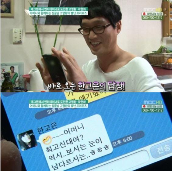 문자는 다름아닌 고명환의 어머니가 한고은에 대해 "'경성스캔들'에서 너무 예쁘게 봤다. 집에 놀러오면 피부에 정말 좋은 음식으로 대접하겠다"고 말한 사실을 두고 고명환이 "지금 녹화 중인데 엄마가 너가 며느리면 좋겠다고 하신다"고 전한 것이다.